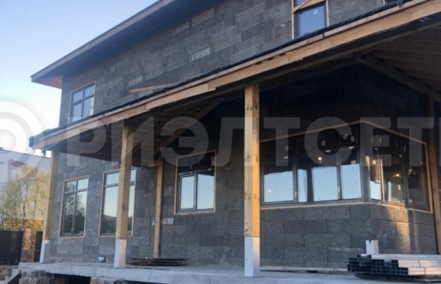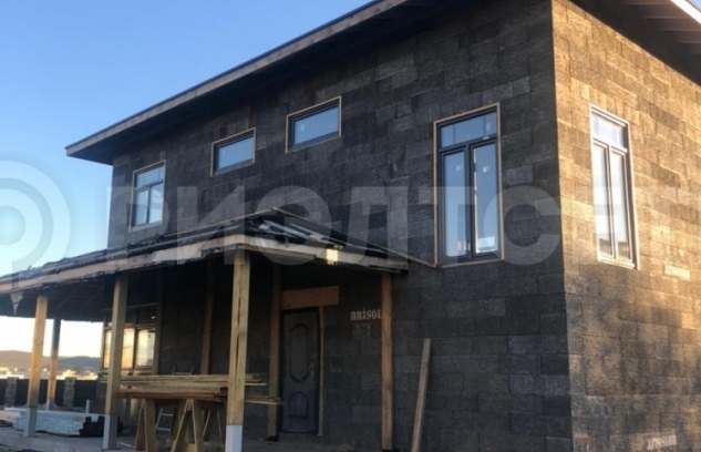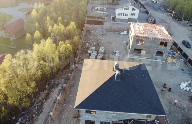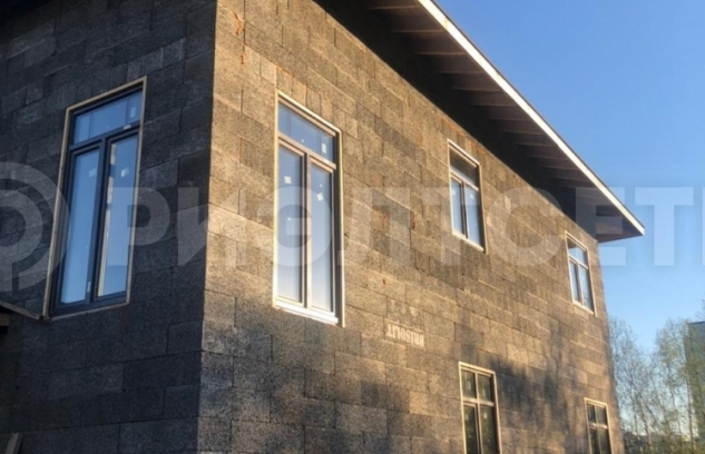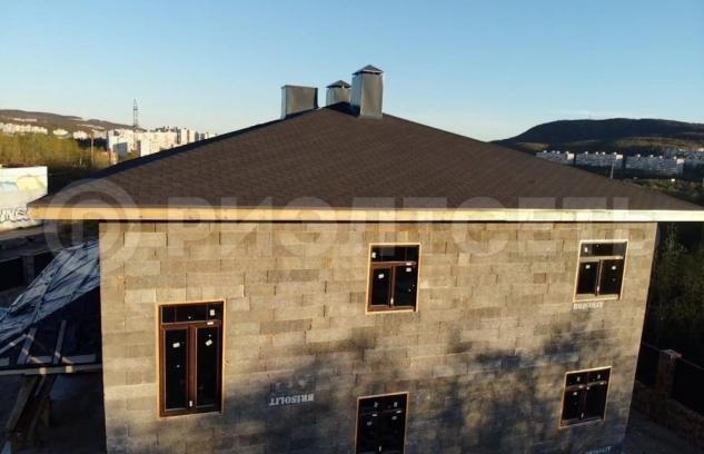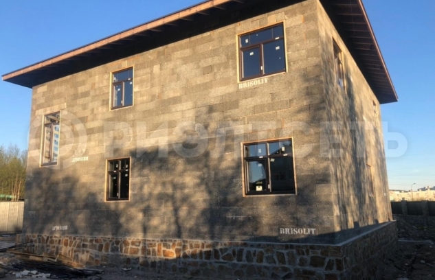 Материал стен дома - армированные, заполненные бетоном блоки теплой несъемной опалубки "Бризолит" (Швейцарская технология), кровельное покрытие - финская гибкая черепица "Катепал". Отделка утепленного цоколя - натуральный камень.