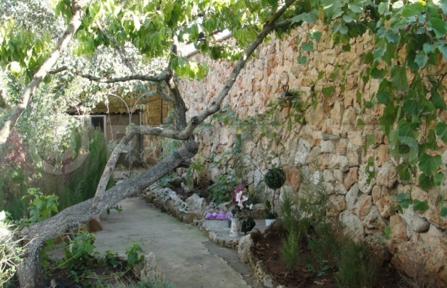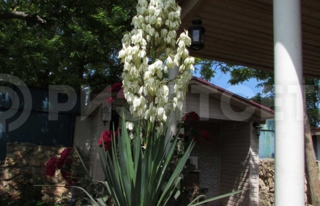 Территория забетонирована и частично покрыта тротуарной плиткой, большие клумбы под цветы и деревья: много плодовых и цветов. Каменный забор по периметру.