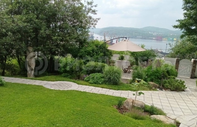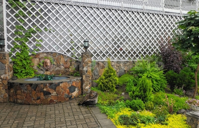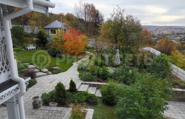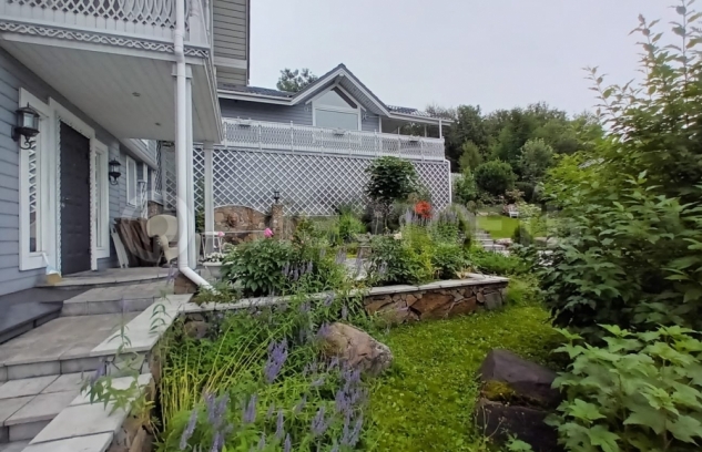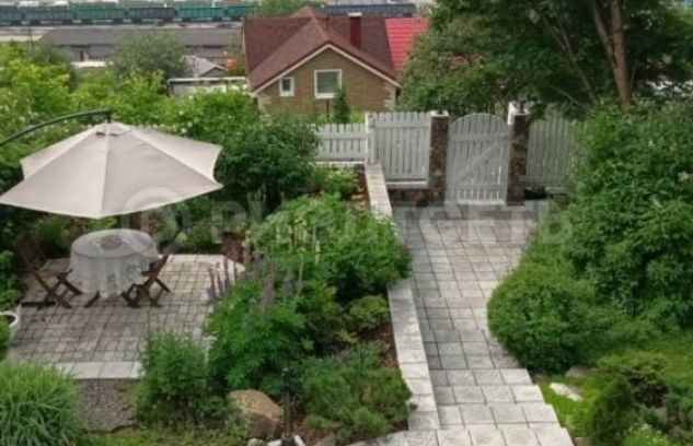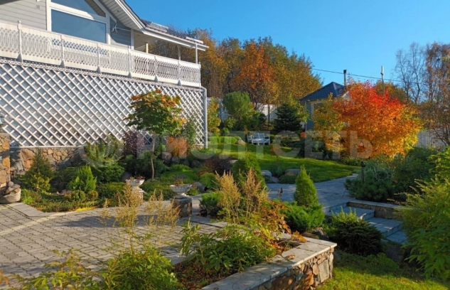 13.Участок с уклоном, территория облагорожена, выполнен каскадный ландшафтный дизайн, цветы, кустарники, деревья, на участке имеется теплица.