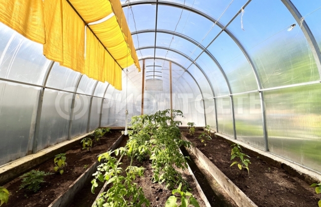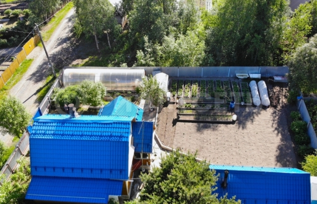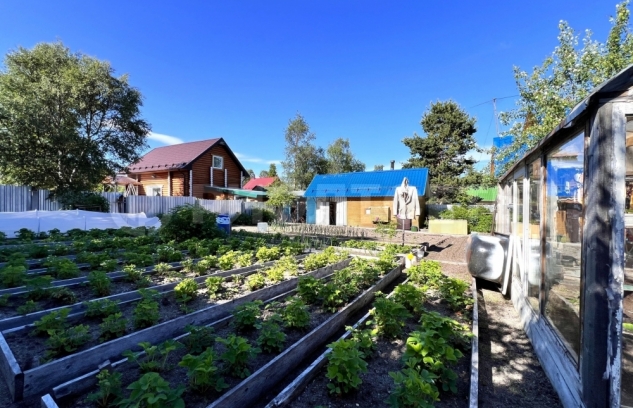 На участке разработан огород, растет клубника, малина, крыжовник и прочие ягоды и овощи. Так же высажены сирень, черная и красная смородина, жимолость.