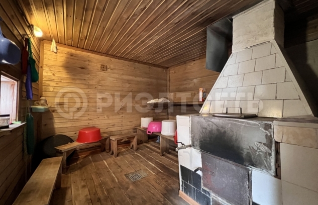 Дом построен по каркасно-щитовой технологии, стены утеплены, внутри из кирпича выложена печь, крыша двускатная из металлочерепицы. Баня из бруса, обшита вагонкой,