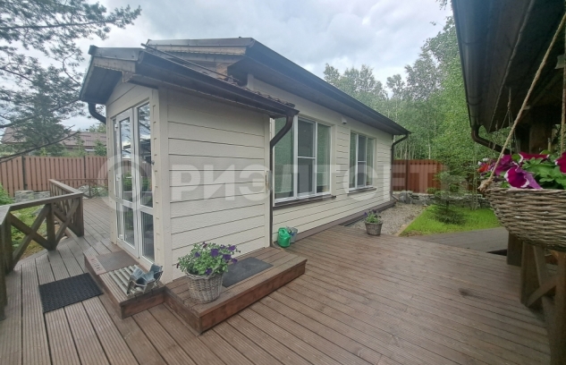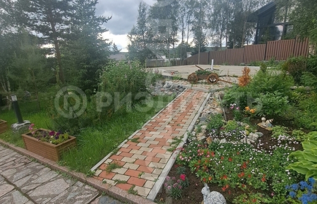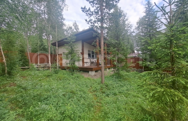 Придомовая территория с уникальным ланшафтным дизайном северного колорита с хвойными деревьями и клумбами с декоративными цветами. Так же много кустов черной смородины и малины. Дорожки и тропинки из камня и плитки, около дома деревянный настил который соединяется с терассой и баней.