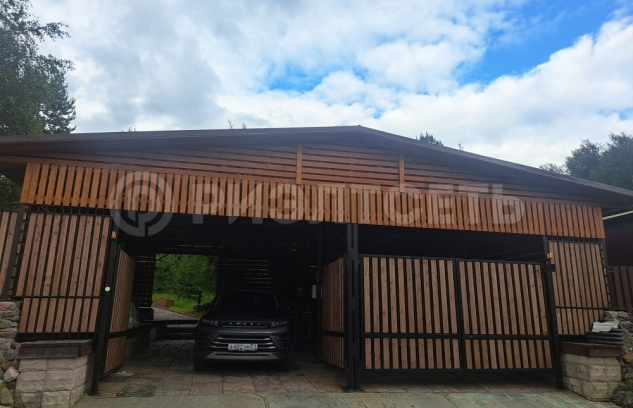 При въезде в дом есть гараж с автоматическими воротами на два машиноместа плюс хозяйственное помещение.