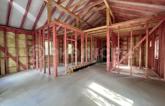 Строительство завершено только по периметру, остались работы по внутренней отделке. На участок выделено 15 кВт электроэнергии. К дому ведёт дорога, и есть официальное разрешение на её благоустройство.