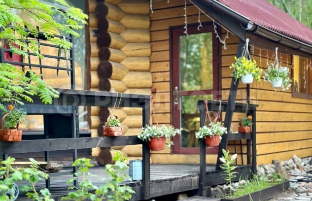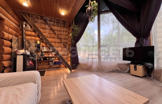 Фундамент ленточный, стены из оцилиндрованного бревна, крыша из ондулина, который не шумит под дождем. В дом подведен городской водопровод, проблемы со скважиной вам не грозят. Канализация - септик, электричество - 15 кВт.