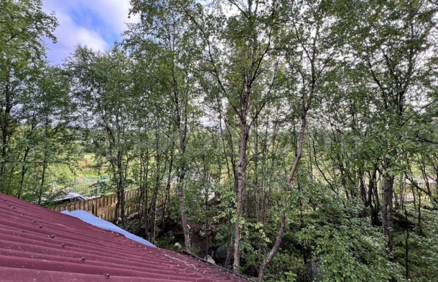 Участок 11 соток с двумя въездами и воротами. На одной его части площадка из бетонных плит, которая может служить фундаментом для гостевого дома или большой парковки. По периметру участка забор с освещением и видеонаблюдением.