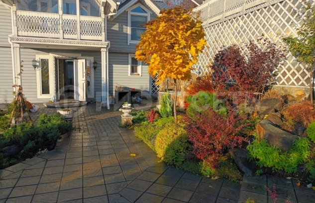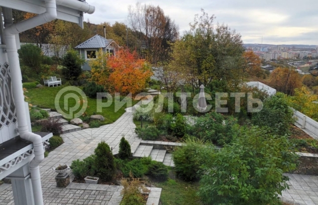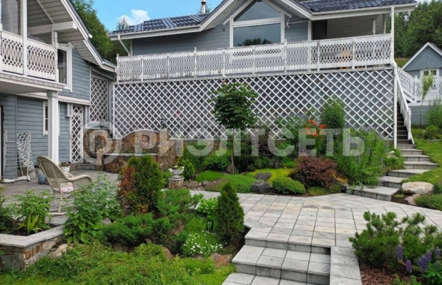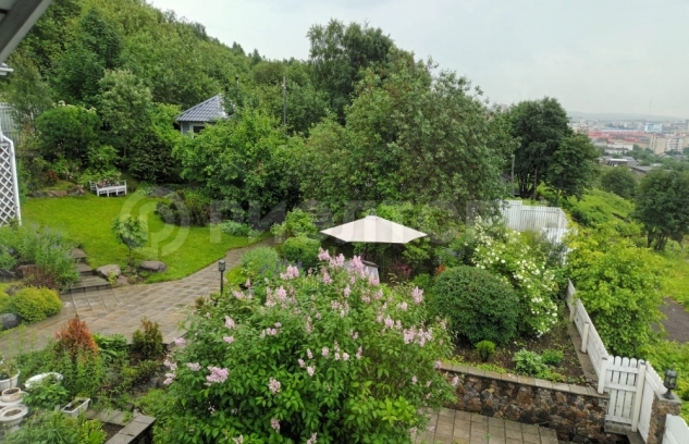 13.Участок с уклоном, территория облагорожена, выполнен каскадный ландшафтный дизайн, цветы, кустарники, деревья, на участке имеется теплица.
